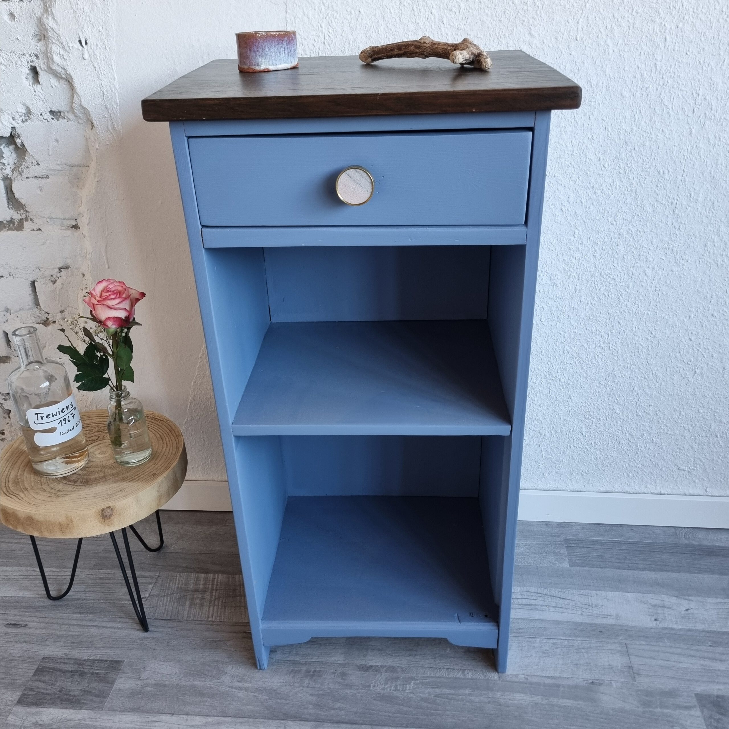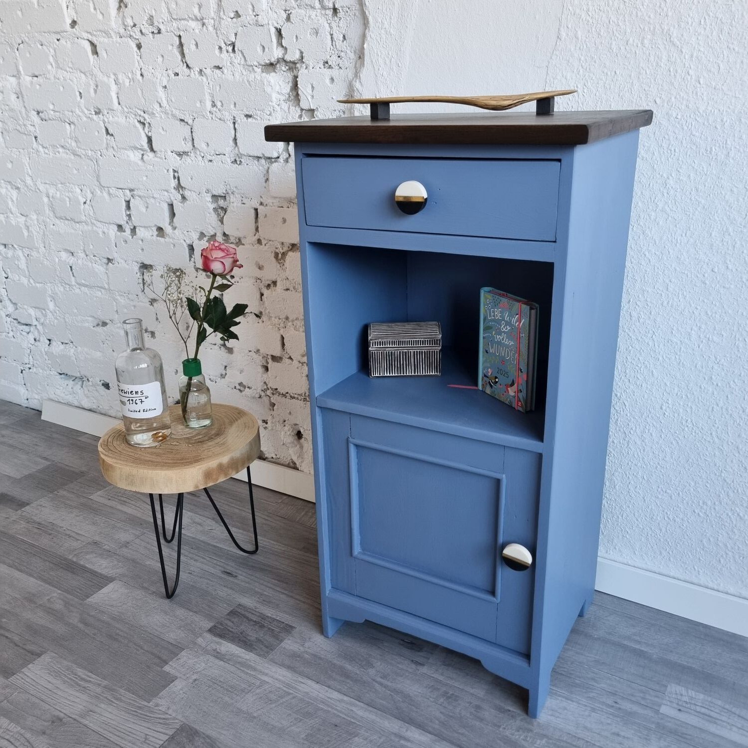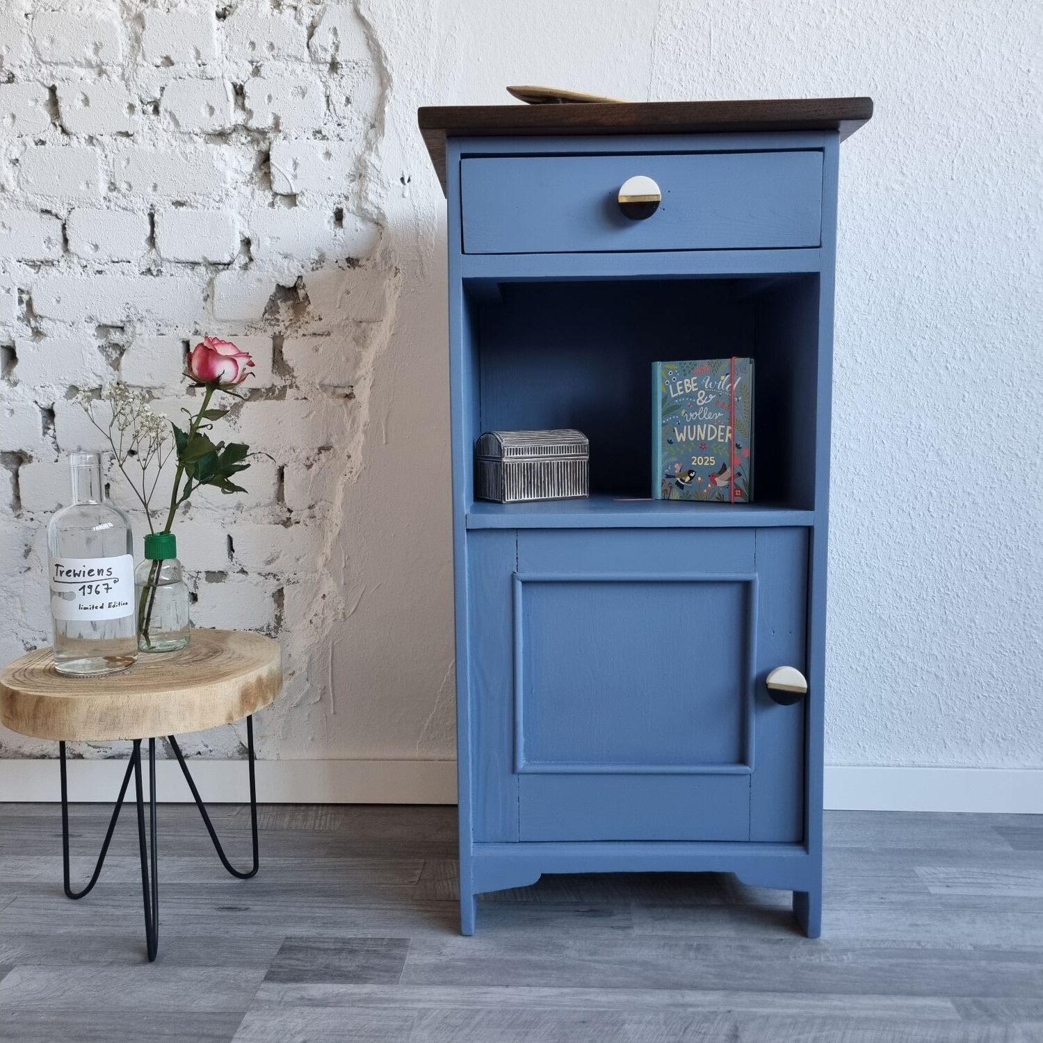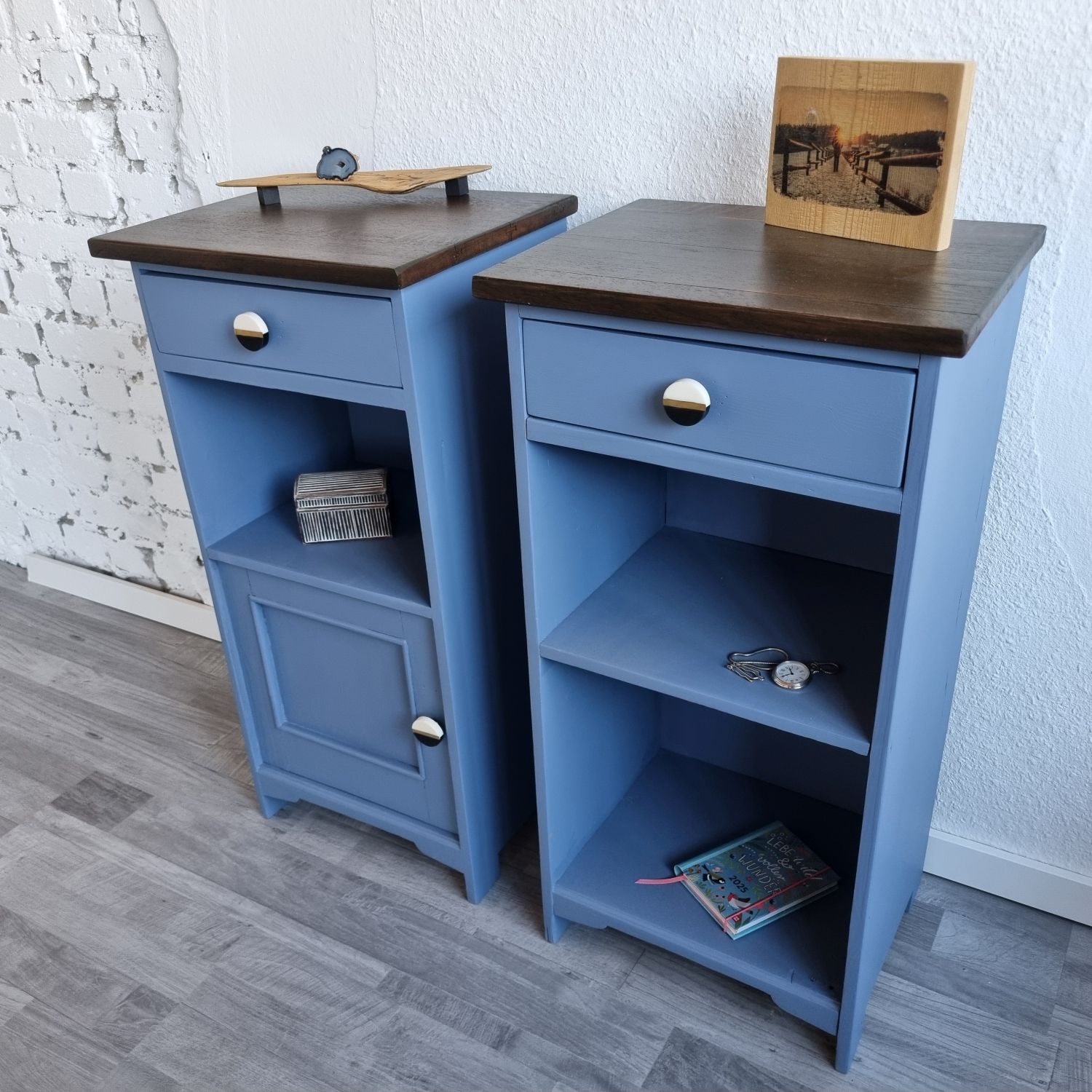 Wahlmöglichkeit: Wer sie als Duo erstehen möchte: die Schubladenknöpfe können auf Wunsch bei beiden gleich werden – sie sind jew. doppelt vorhanden. Auch die Schubladen können wahlweise beide mit Vliestapete oder in blau gehalten werden.