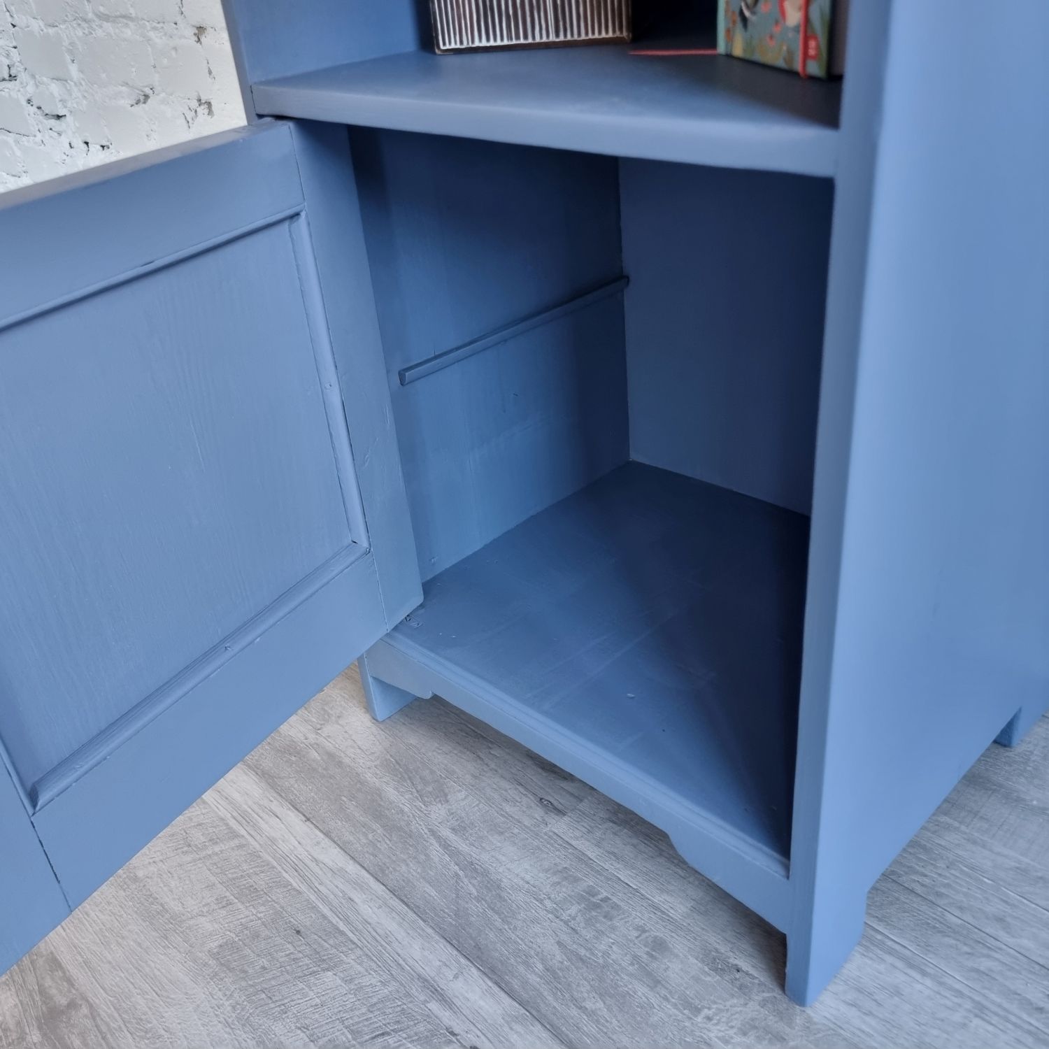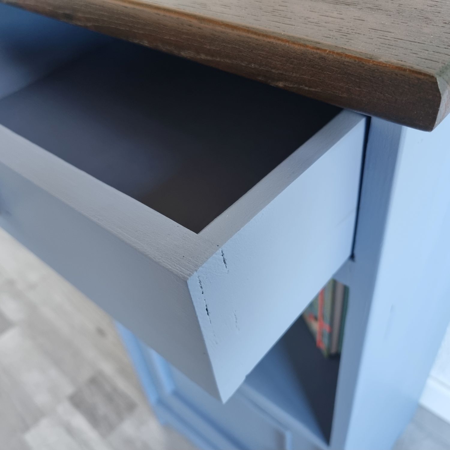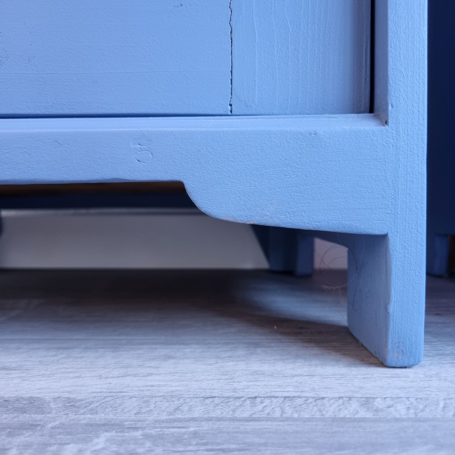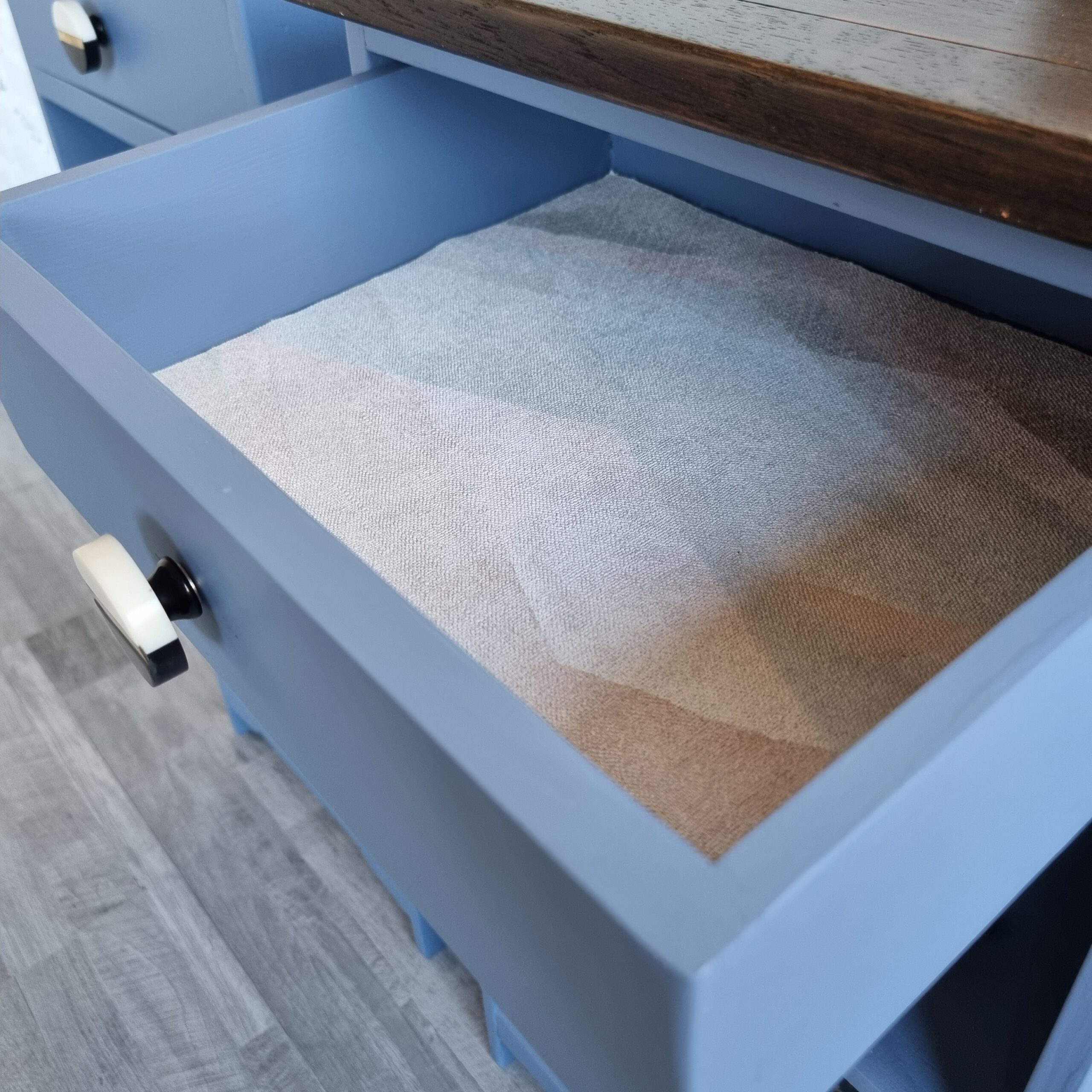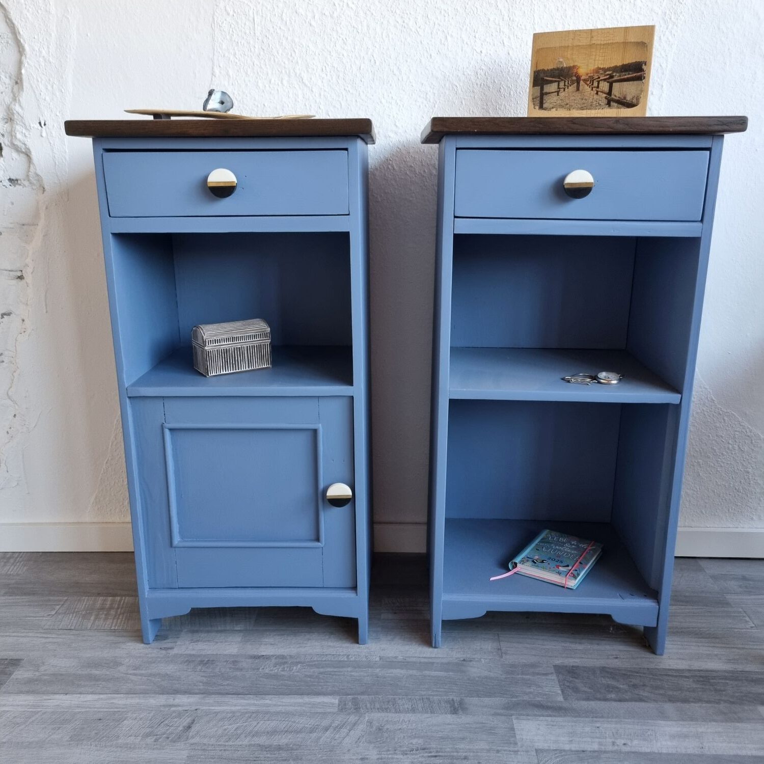 Wahlmöglichkeit: Wer sie als Duo erstehen möchte: die Schubladenknöpfe können auf Wunsch bei beiden gleich werden – sie sind jew. doppelt vorhanden. Auch die Schubladen können wahlweise beide mit Vliestapete oder in blau gehalten werden.