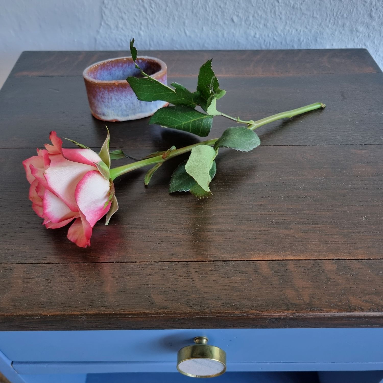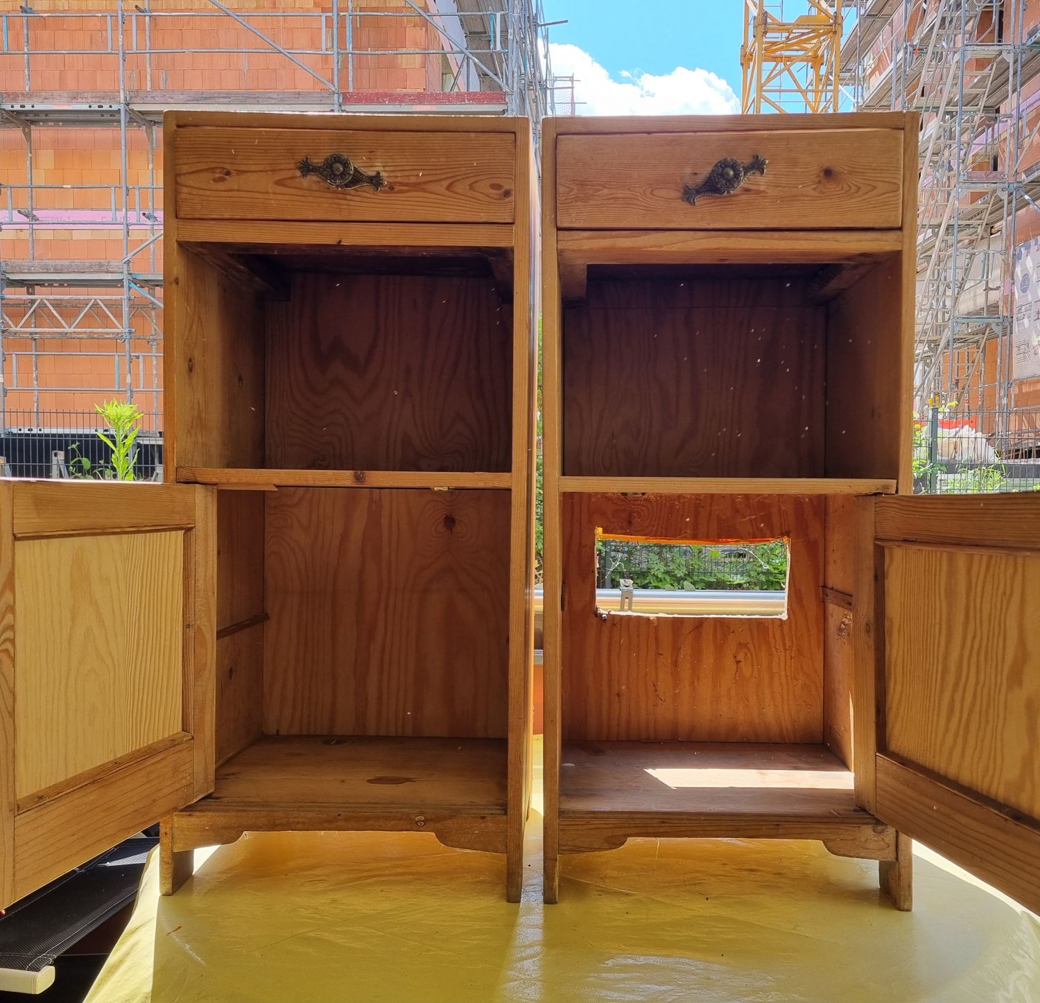 Sie sind echte Fundstücke, die sehr hohen  Upcycling-Bedarf hatten. Gefunden an einer Straße in Nordrhein-Westfalen. Beide Deckplatten fehlten, und hinten war einer der Nachtschränke eingesägt zum Kabeldurchlass … die Rückwand also zu erneuern, neue Deckplatten aufzutun.