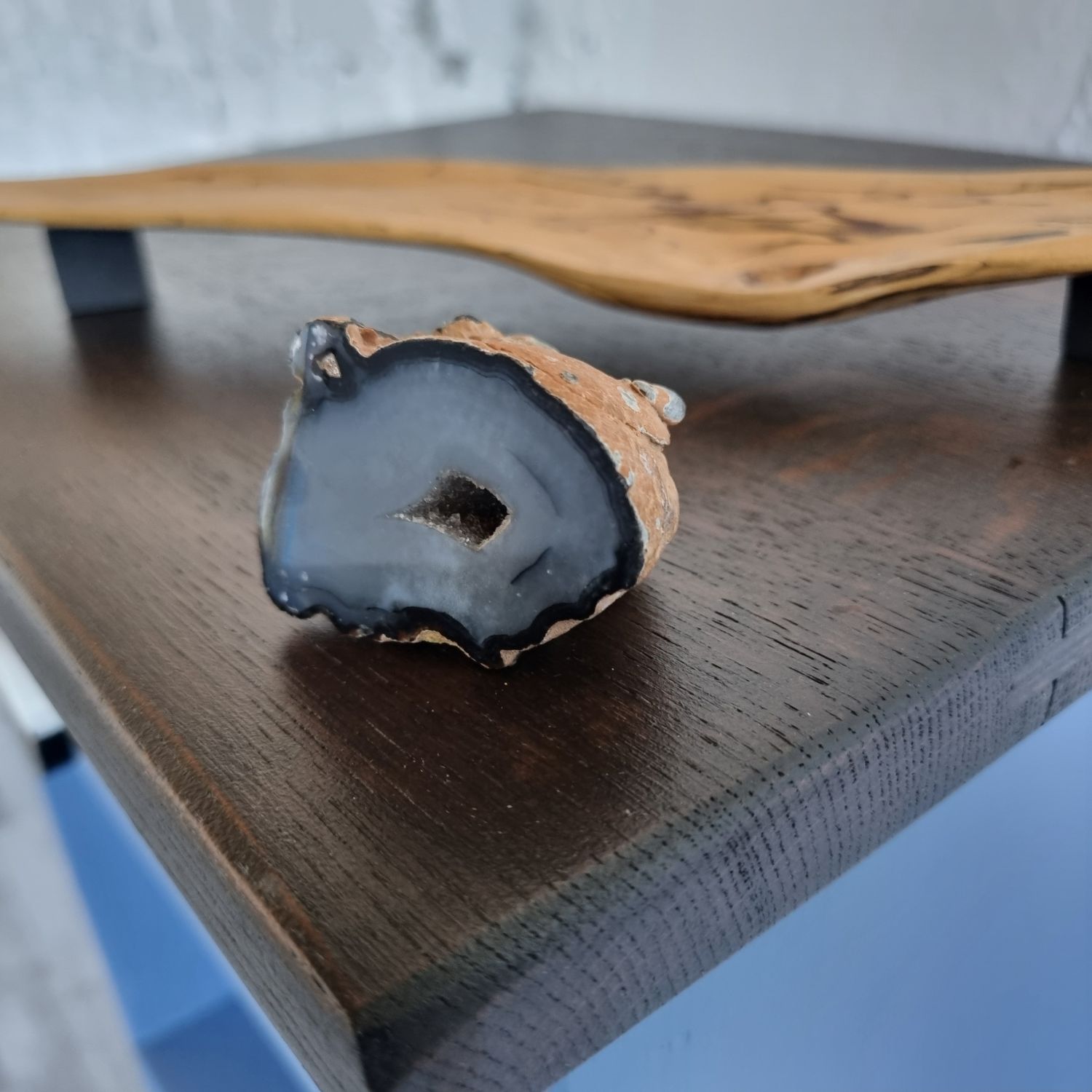 Die Aufbereitung nahm viel Zeit in Anspruch. Jetzt sind sie wieder voll funktionsfähig, außen und innen gesäubert, geschliffen, lackiert und versiegelt. Der Korpus ist aus Weichholz. Die massiven neuen Deckplatten sind dagegen aus Eiche und Upcycling pur. Sie stammen aus einer ausrangierten alten Tischplatte, die ich im Holzfundus von Build Share Repair e.V. Erfurt fand. Ihre wunderbare Maserung ist durch Beizen hervorgeholt, als Kontrast zum strahligen Blau ist ein dunkles, tiefes Braun gewählt.